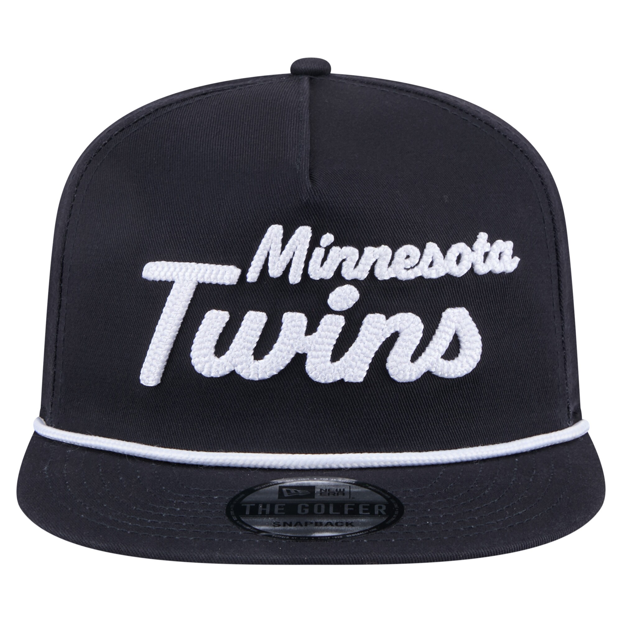 Support your Minnesota Twins with this Team Text Golfer Snapback Hat from New Era. The Golfer is a semi-structured cap with a pinched crown and flat visor that delivers a retro look reminiscent of snapbacks from the '80s and '90s. Featuring chain stitch embroidered details, this hat boldly displays the Minnesota Twins wordmark on the front and team logo on the right panel.